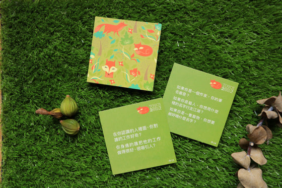 ,卡片底色是青草綠,背卡是小狐狸窩在草地上,問句有: